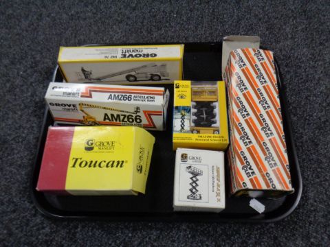 A tray containing six boxed Grove die cast vehicles to include scissor lift platforms, articulating telescopic booms, toucan