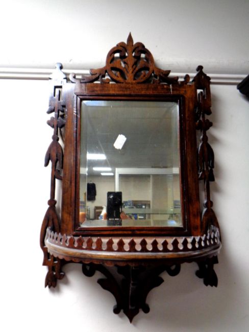 A Victorian fretwork framed mirror with demi lune shelf