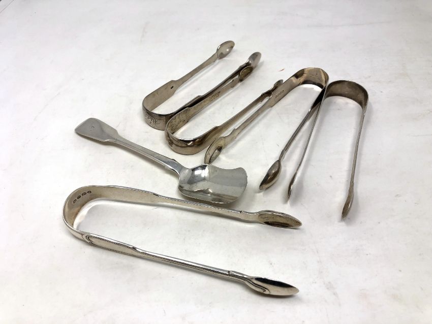 Five pairs of Georgian/William IV sugar tongs and a spoon, two with Scottish marks