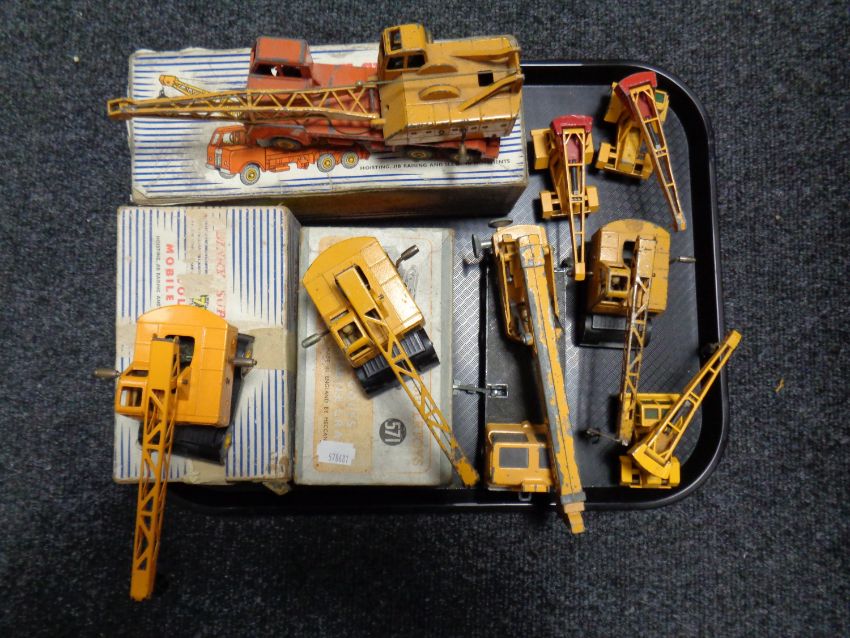 A tray containing boxed and unboxed Dinky and Matchbox die cast cranes to include Dinky Super toys Coles Mobile Crane 751, Dinky Super toys Coles Mobile Crane 971 and Dinky Super toys 20 tonne lorry mounted crane 972
