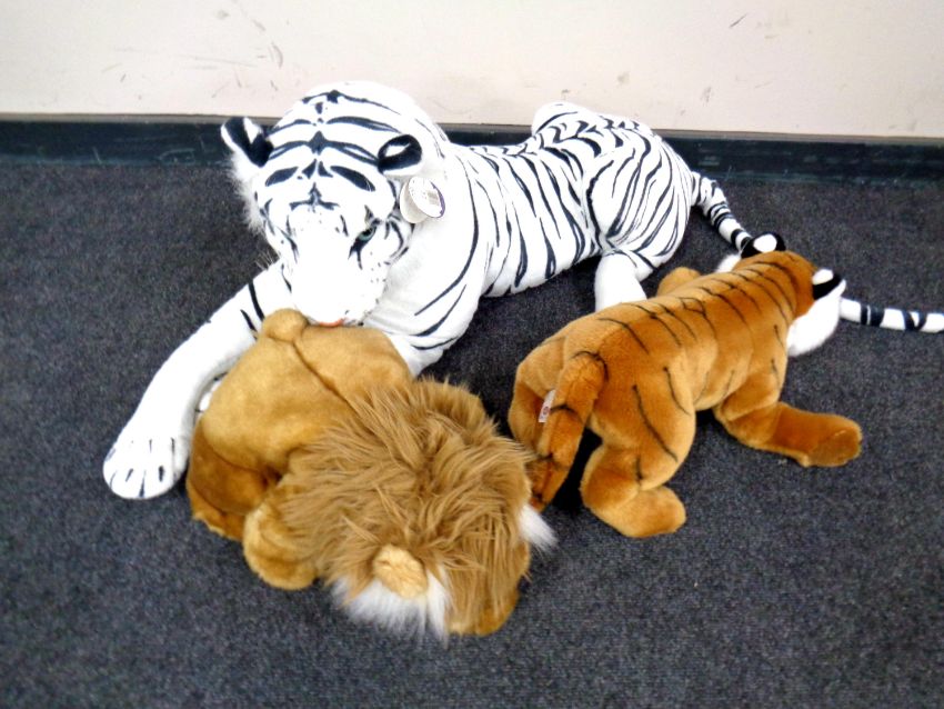 Three soft toys by Cuddle Times and Keel Toys, tigers and lions