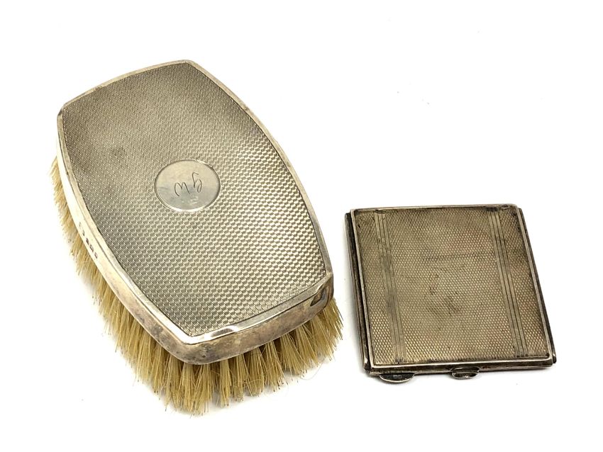 A silver compact with engine turned decoration, together with a silver dressing table brush