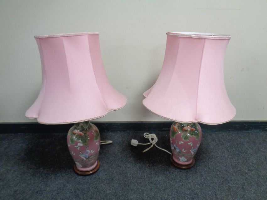 A pair of pink glazed ceramic table lamps depicting storks, with shades