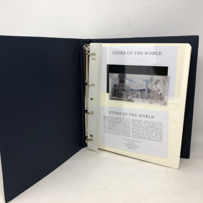 A binder of eleven silver Skyline Dollar banknotes depicting cities of the world, each fine silver and weighing 5g