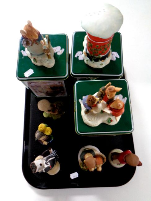 A tray containing three Villeroy and Boch fox wood tail ornaments in tins together with five further country bird collection and country companion figures