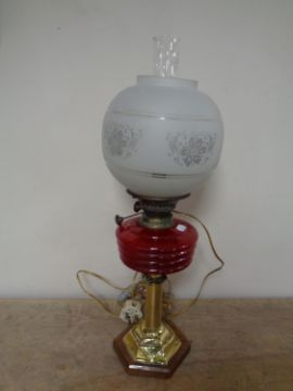 A Duplex brass oil lamp on wooden base with red glass reservoir, opaque shade and chimney (converted)