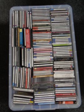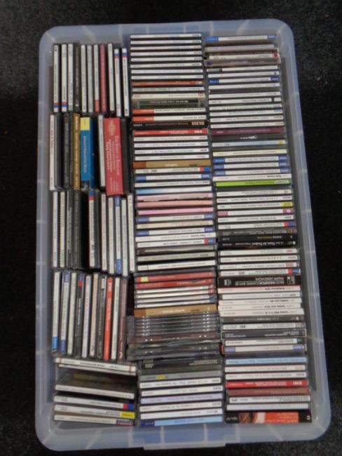A large plastic storage crate containing a large quantity of CDs, classical etc