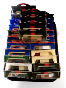 A tray containing 25 die cast vehicles to include Days Gone, Military, Royal Mail, Pepsi Cola (boxed)