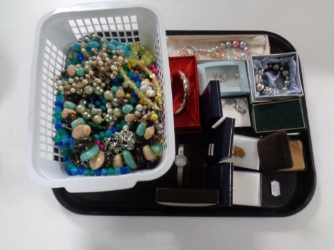 A tray of a quantity of costume jewellery to include beaded necklaces, pave brooch, pendants on chains, lady's and gent's watches