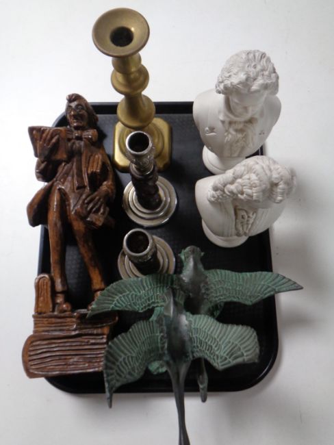 A tray of two chalk busts of Beethoven and Handel, carved wooden figure, candlesticks, bronze figure of ducks in flight