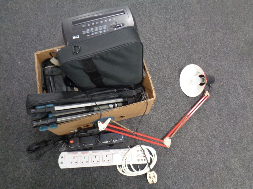 A box containing extension leads, camera tripods, angle poise lamp, laptop bag, paper shredder etc