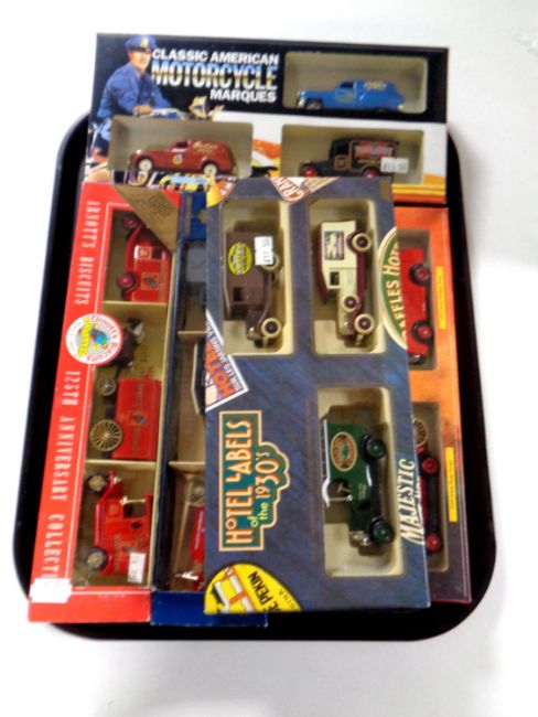 A tray containing five die cast car sets to include London's Fire Engine, Classic American Motorcycle Marques, Hotel labels of the 1930s etc (boxed)