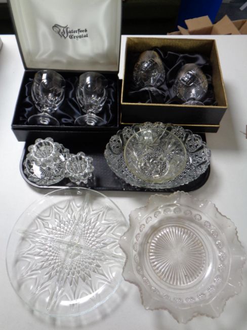 A tray of assorted glass ware to include boxed pair of Waterford crystal goblets, boxed pair of Webb Corbet brandy glasses, glass dishes and candle holders