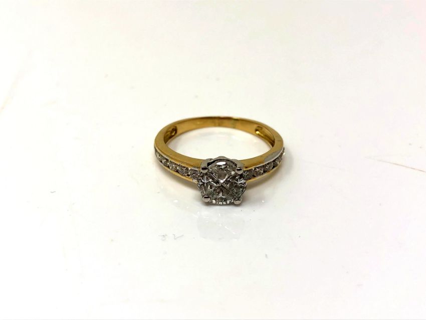 A pie-cut diamond ring on yellow gold shank set with diamond shoulders, size L.