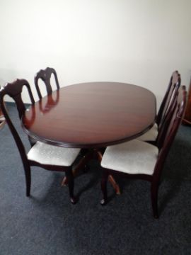 A circular extending pedestal dining table together with a set of four Queen Anne style chairs in a mahogany finish