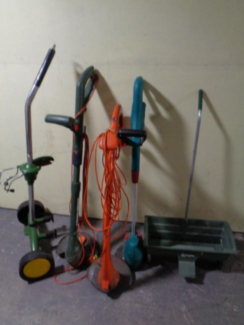 Three assorted garden strimmers together with a seed spreader
