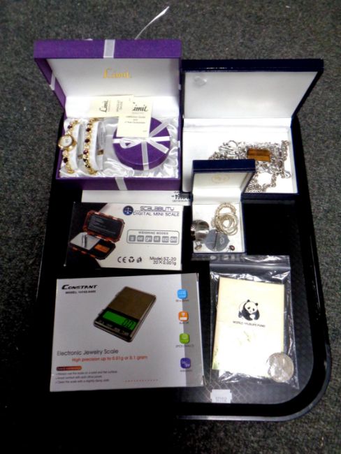 A tray of costume jewellery, lady's bracelet and watch set, WWF coin, digital scales