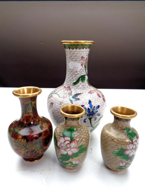 A pair of cloisonne vases, height 10cm, together with two further vases