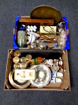 Two boxes containing miscellaneous to include plated wares, cased servers, Royal Doulton vase (as found), brass sugar tongs, glass preserve pots on plated stands, Wedgwood salt and pepper pot etc