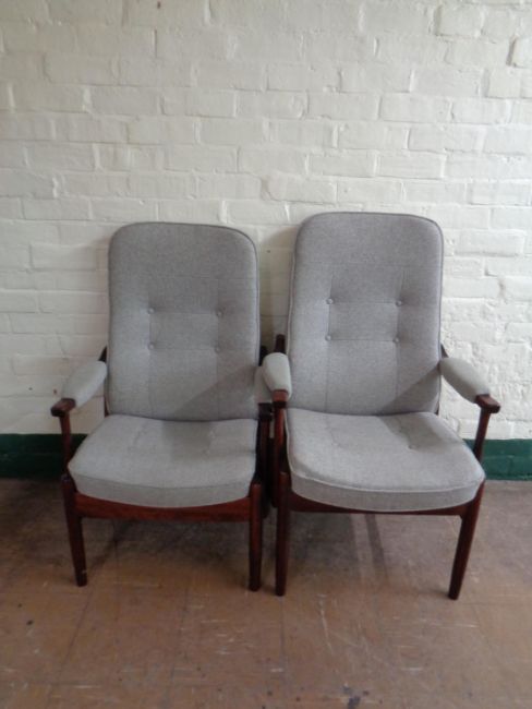 A pair of stained beech high backed armchairs upholstered in a grey fabric