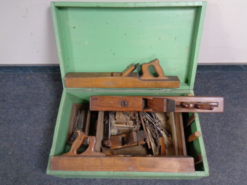 A 20th century painted pine box containing a quantity of vintage woodworking tools to include block planes, hand planes, etc