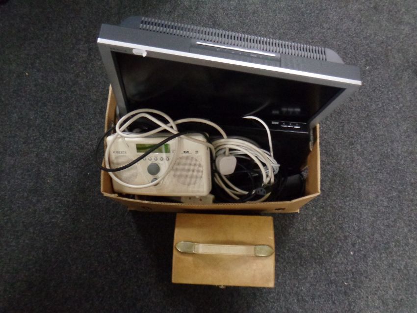 A box containing Sony Bravia TV with remote, Roberts digital radio, mid 20th century Sky casket transistor radio