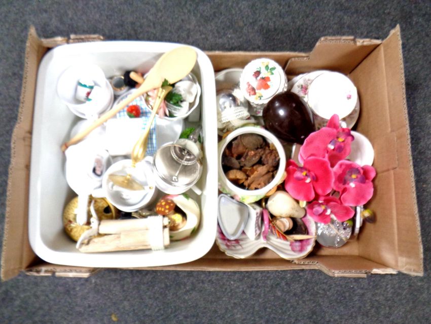 A box containing miscellaneous china to include two Royal Albert china trios, trinket dishes etc