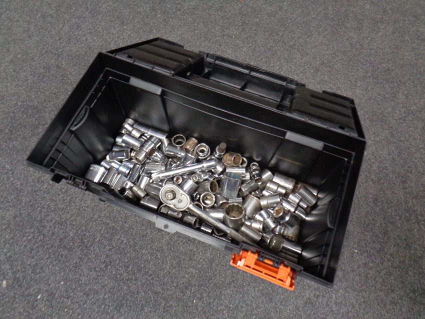 A plastic toolbox containing socket sets