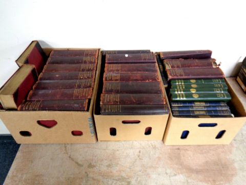 Three boxes containing 20th century volumes to include The Encyclopedia Britannica 11th edition, New musical educator, Modern mining practice etc