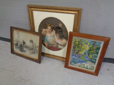 An oak framed tapestry, woodland scene, together with an early 20th century pencil sketch, sheep dog with rams, and an Edwardian colour lithographic print, two children