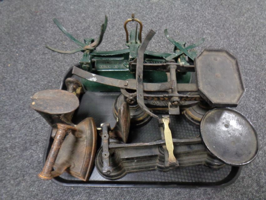 A tray of three sets of vintage kitchen scales together with a flat iron