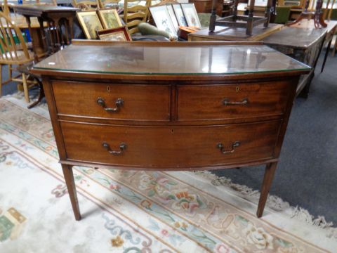 An Edwardian mahogany bow fronted three drawer chest with glass top