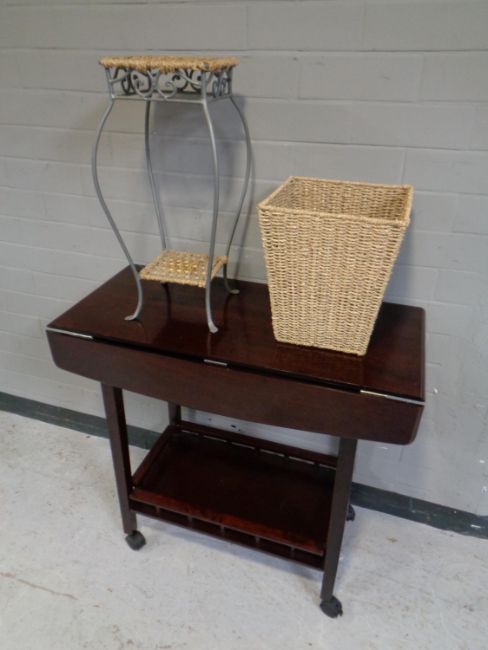 A contemporary two tier flap sided tea trolley together with a wicker and metal two tier plant stand and a wicker bin