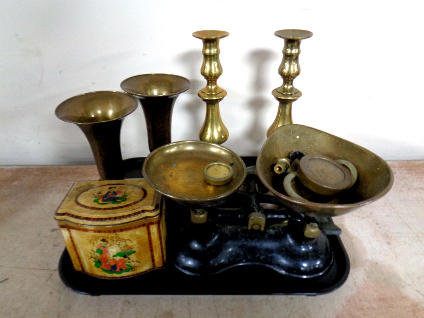 A tray of assorted brass wares to include antique brass candlesticks, Indian brass vases, kitchen scales with weights