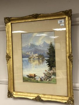 Clifford George Blampied (1875-1962) : Italian lake scene with island and mountains beyond, watercolour, signed, 35 x 25 cm, framed