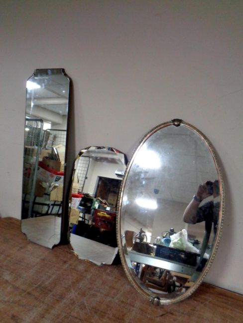 An Edwardian chrome framed oval bevel edged mirror together with two frameless mirrors