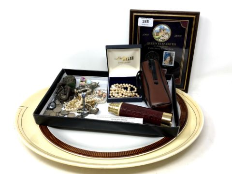 A quantity of six pences, costume jewellery, framed Queen Mother Centenary Collection coin and stamp set, pocket telescope etc