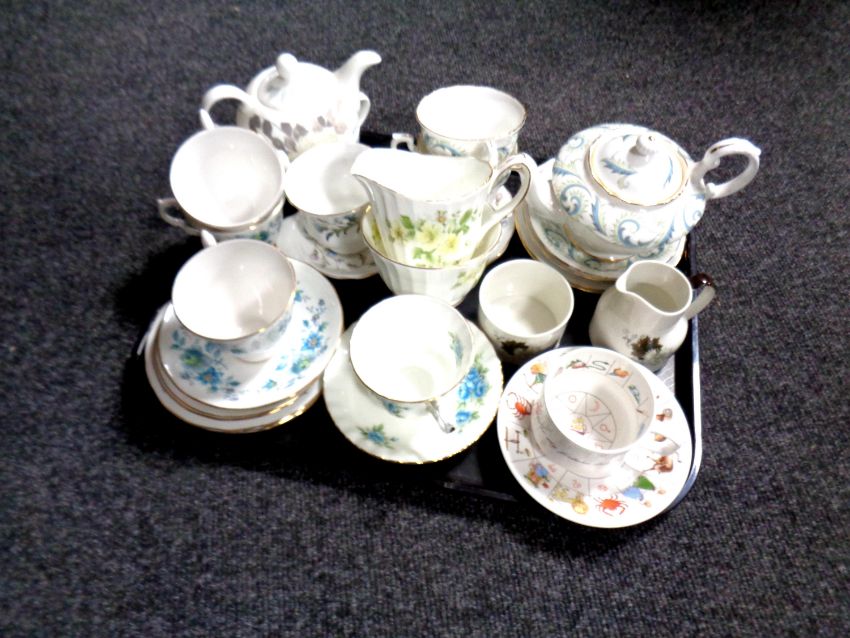 A tray containing assorted tea china to include a seven piece Royal Stafford garland tea for two, Royal Doulton Westwood milk jug and sugar basin, Royal Kendall and Royal Albert coffee cups and saucers