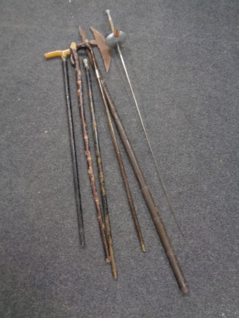 A bundle containing assorted walking sticks to include plated pommel examples, fencing foil, ornamental axe