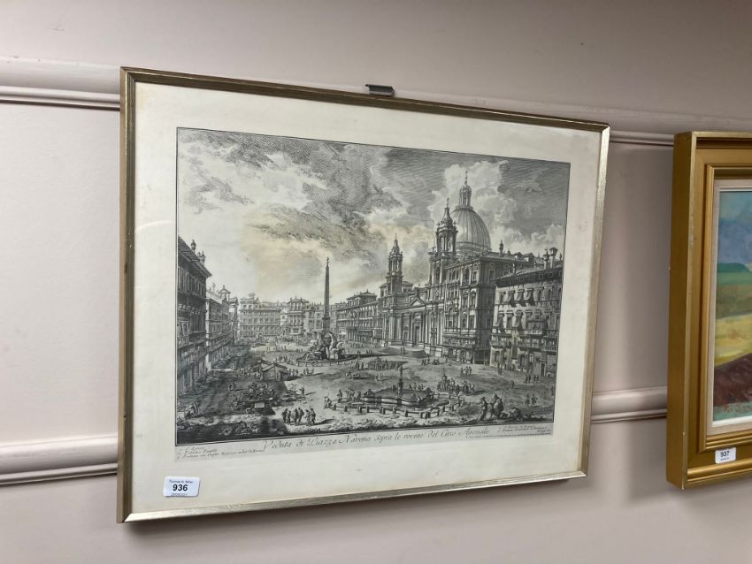 A 19th century engraving depicting an Italian plaza, 53 x 40 cm