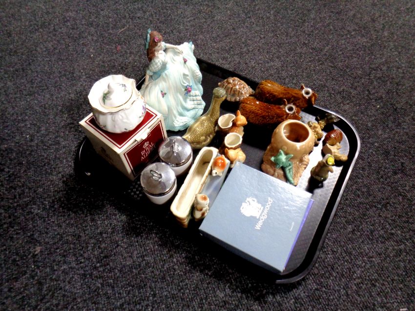 A tray containing miscellaneous to include Coalport Age of Elegance figure, The Balcony, boxed Wedgwood pin dishes, Wade Whimsies, a Beswick Loch Ness monster, Beneagles Scotch whisky decanter, Royal Worcester egg coddlers etc