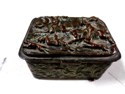 An antique plated embossed snuff box depicting a hunting scene (as found)