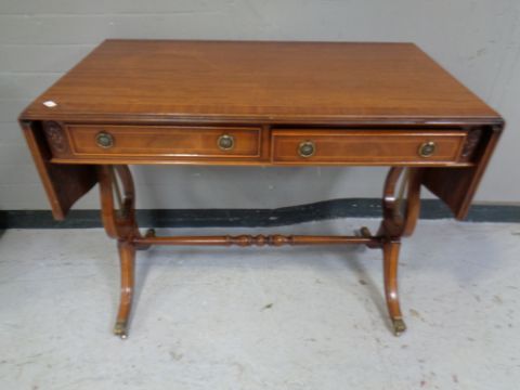 A Regency style inlaid mahogany sofa table fitted two drawers