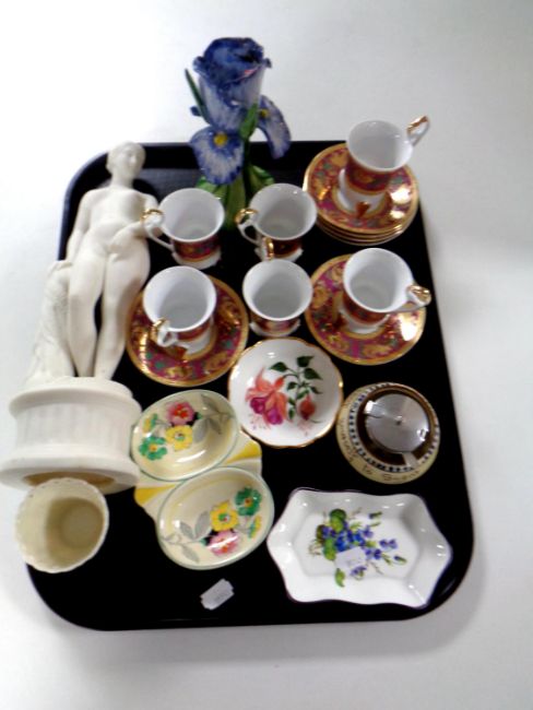 A tray containing six china craft coffee cans and saucers, Parian figure, Torquay ware dish, Belleek basket