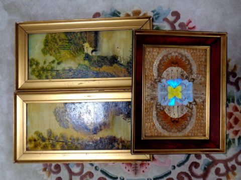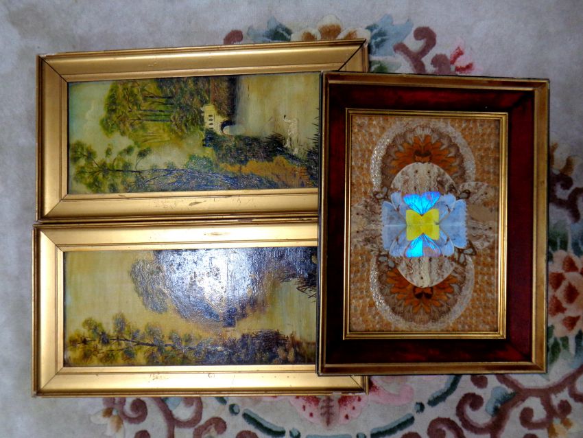 A pair of antiquarian oils on boards, river scenes, in gilt frames, together with a framed butterfly picture