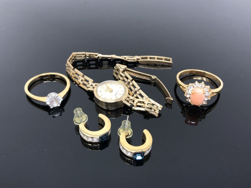A lady's 9ct gold Avia wristwatch in 9ct gold bracelet, together with two dress rings and a pair of earrings.