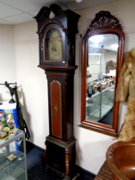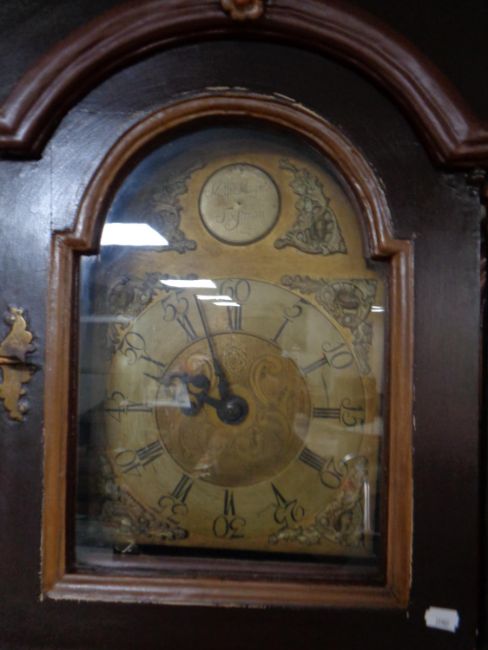 A 19th century painted cased continental grandfather clock with brass dial, pendulum and weights