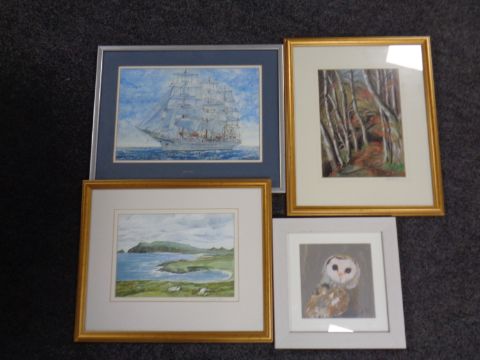 An R M Norie watercolour of a tall ship, framed, together with three other framed watercolours