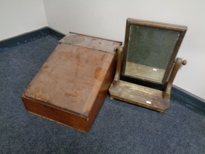 A 19th century pine toilet mirror together with an antique clerk's writing slope, fitted seven internal drawers