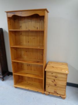 A set of pine open bookshelves together with a pine three drawer bedside chest